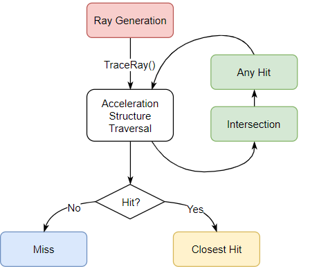 Unlike how rasterization writes to a render target, the raytracing pipeline writes to an image using a unordered access view (UAV). With rasterization we execute a draw through Draw* methods on the command list. With Raytracing, we will execute the DispatchRays method. The number of rays we generate can be customized, but for our rendering we will draw one ray per pixel. The GPU pipeline for raytracing is depicted through this simplified control flow diagram: